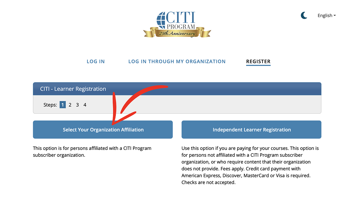 Step 1: Go to the CITI Program website and click “Register” as a first-time user. What this looks like.