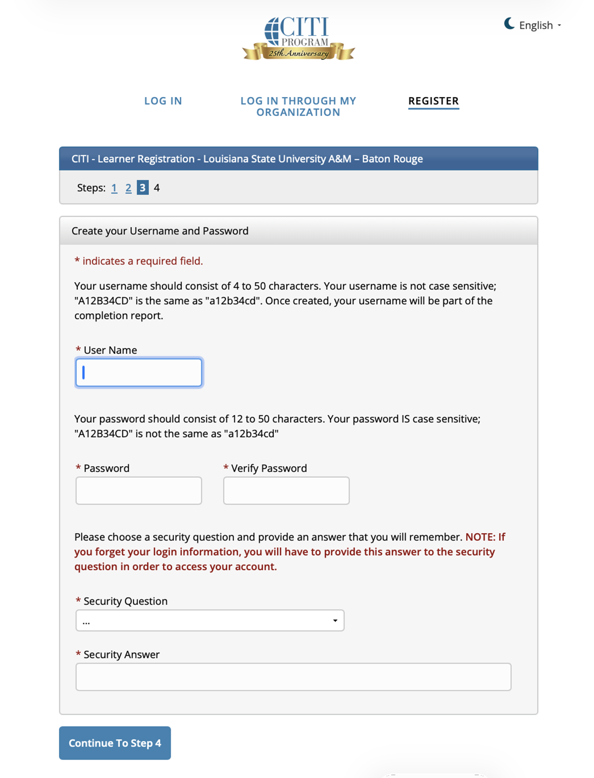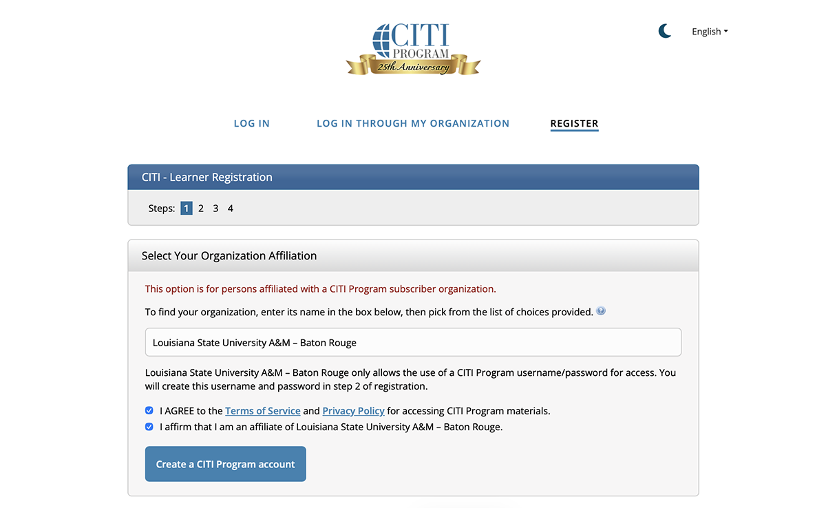 Step 3: Start typing “Louisiana” in the search box and select “Louisiana State University A&M - Baton Rouge” from the drop-down menu. Check the boxes below to agree and affirm, and then the blue button: “Create a CITI Program account.” What this looks like.